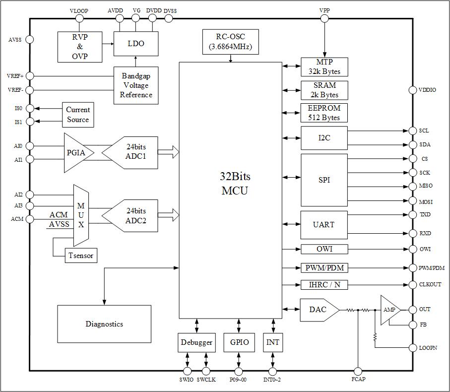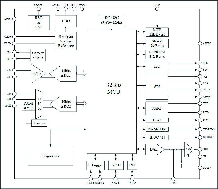 內(nèi)置雙24 bits ADC,低噪聲PGA,支持差分和單端輸入,可切換至內(nèi)部溫度傳感器