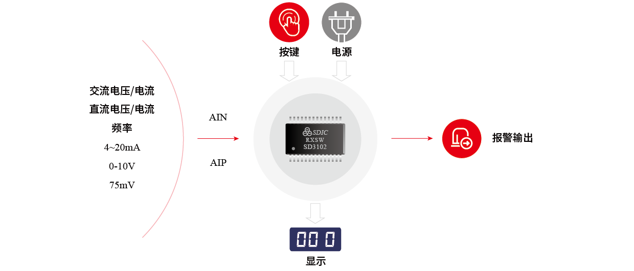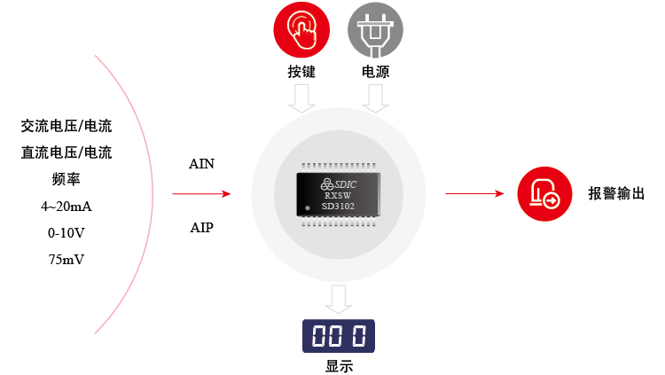 本系列產(chǎn)品針對(duì)數(shù)顯表頭應(yīng)用設(shè)計(jì),芯片集成了T-RMS計(jì)算器、顯示驅(qū)動(dòng)、DSP單元等功能電路,在交直流表頭應(yīng)用具備成熟方案,可實(shí)現(xiàn)交直流電壓、交直流電流、頻率等常見工業(yè)電信號(hào)的高精度測(cè)量,同時(shí)可擴(kuò)展報(bào)警輸出功能。內(nèi)部集成先進(jìn)的校準(zhǔn)算法,滿足測(cè)量精度的情況下,極大的節(jié)省客戶的校表時(shí)間,且校準(zhǔn)系數(shù)可保存至芯片內(nèi)部,節(jié)省外部存儲(chǔ)器。