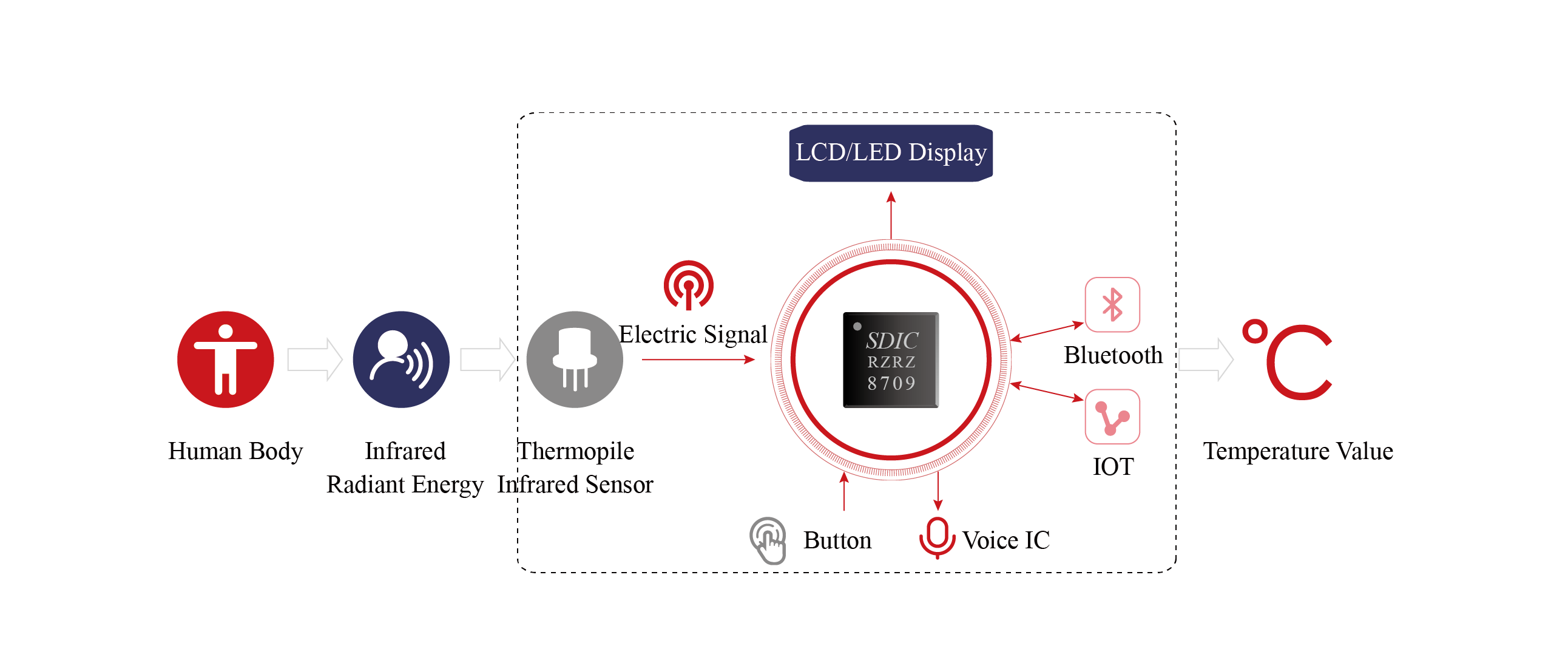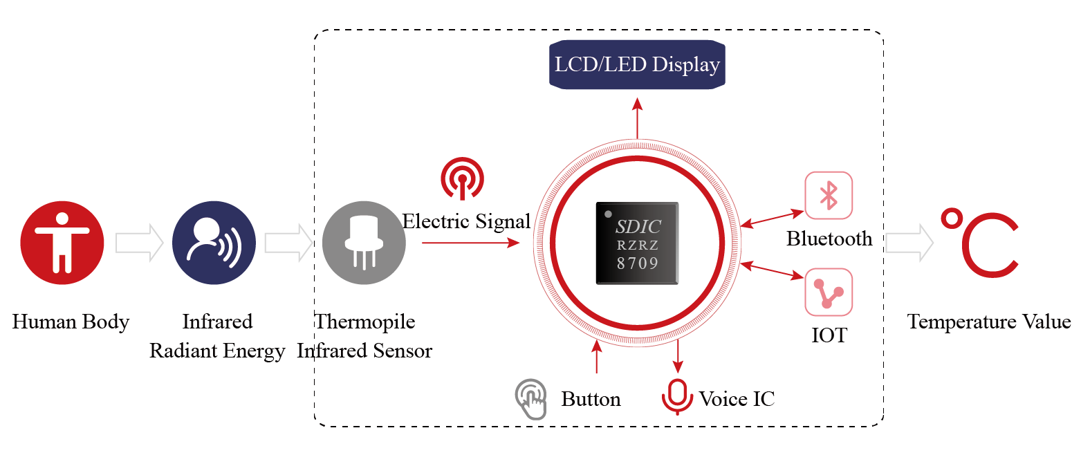In recent years, non-contact infrared temperature measurement has developed rapidly. The performance and functions have greatly improved. The variety of applications continue to increase and expand. Our SD8000 series infrared thermometer solution, the temperature is measured by the thermopile infrared sensor and the signal is transmitted to the IC, which is displayed by the LCD. This thermometer has simple circuit, few peripheral components, low power consumption, accurate and quick reading, non-contact type, safe use and long service life, and response time is fast.