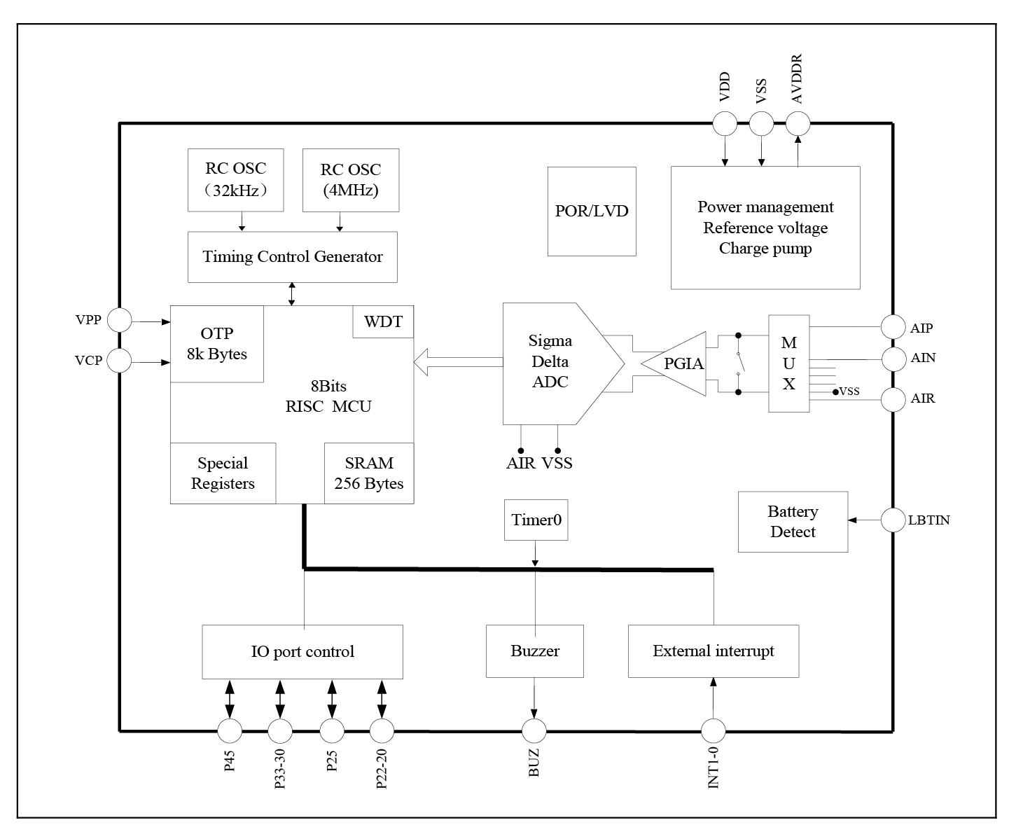 8 bits RISC ultra low power MCU, 49 instructions and 6 stack levels. The MCU current consumption is 500uA typically at 3V and 2MHz operating clock rate, 1μA at standby and 32kHz clock, and less than 1μA at sleep