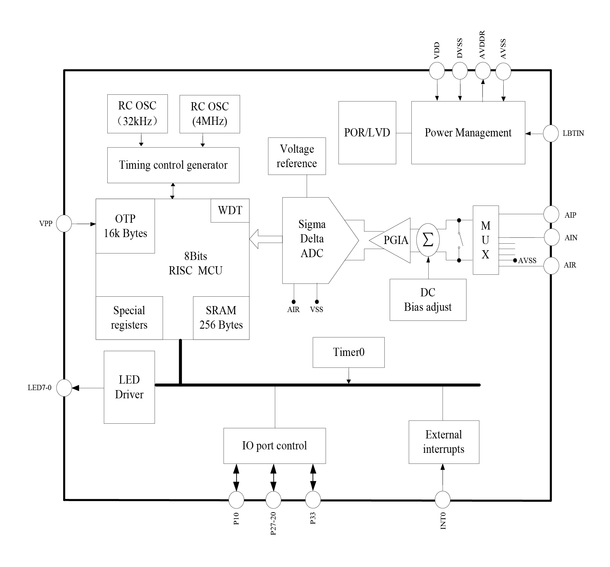 8 bits RISC ultra low power MCU, 49 instructions and 6 stack levels. The MCU current consumption is 600uA typically at 3V and 2MHz operating clock rate, 2μA at standby and 32kHz clock, and 1μA at sleep