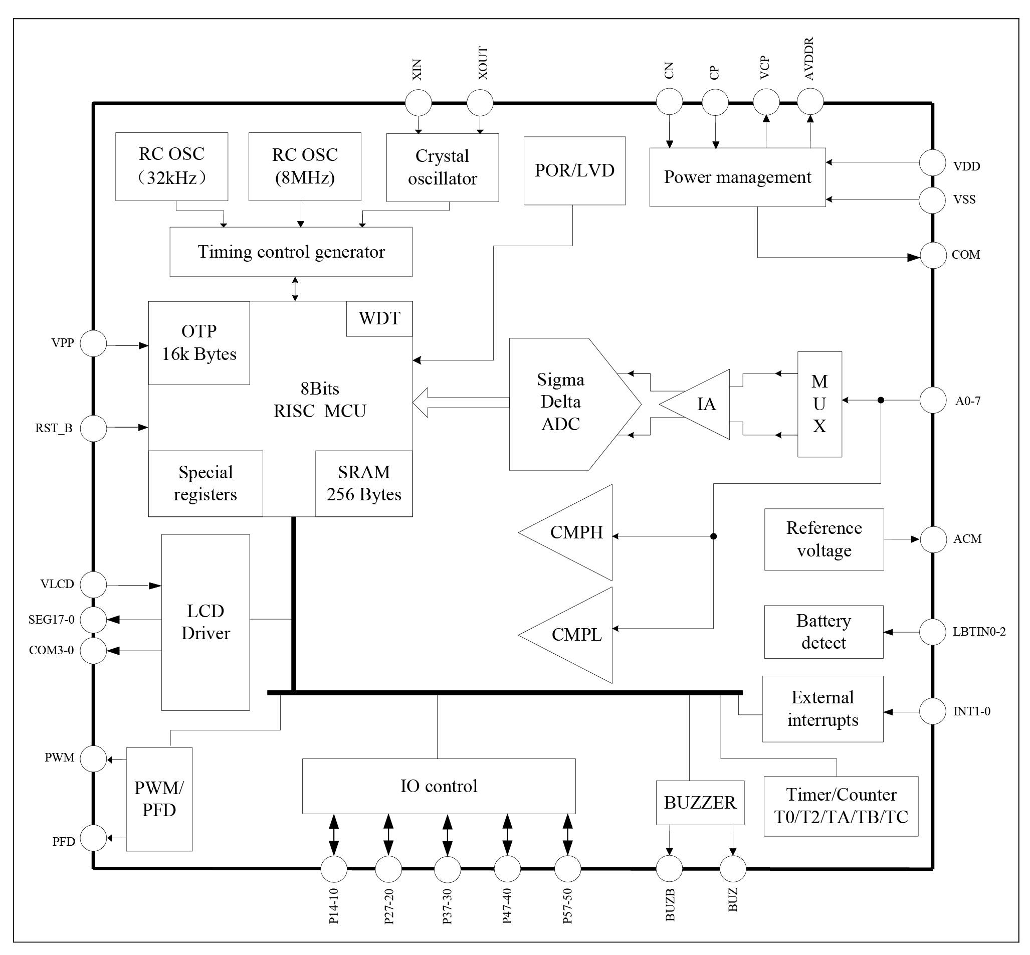 8 bits RISC ultra-low power MCU, 49 instructions and 6 stack levels. The MCU current consumption is 400μA typically at 3.3V and 2MHz operating clock rate. Standby current is 1.5μA at 32kHz clock, and less than 1μA at sleep
