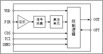 內(nèi)置運(yùn)算放大器,可與多種PIR 傳感器匹配,進(jìn)行信號預(yù)處理