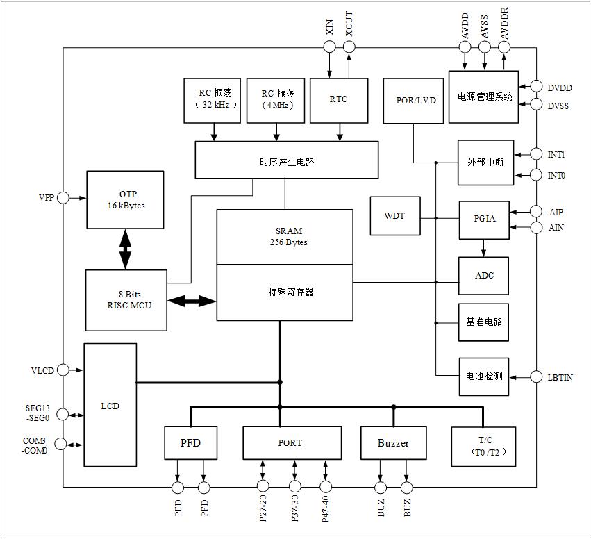 16k Bytes OTP程序存儲(chǔ)器,256 Bytes SRAM 數(shù)據(jù)存儲(chǔ)器