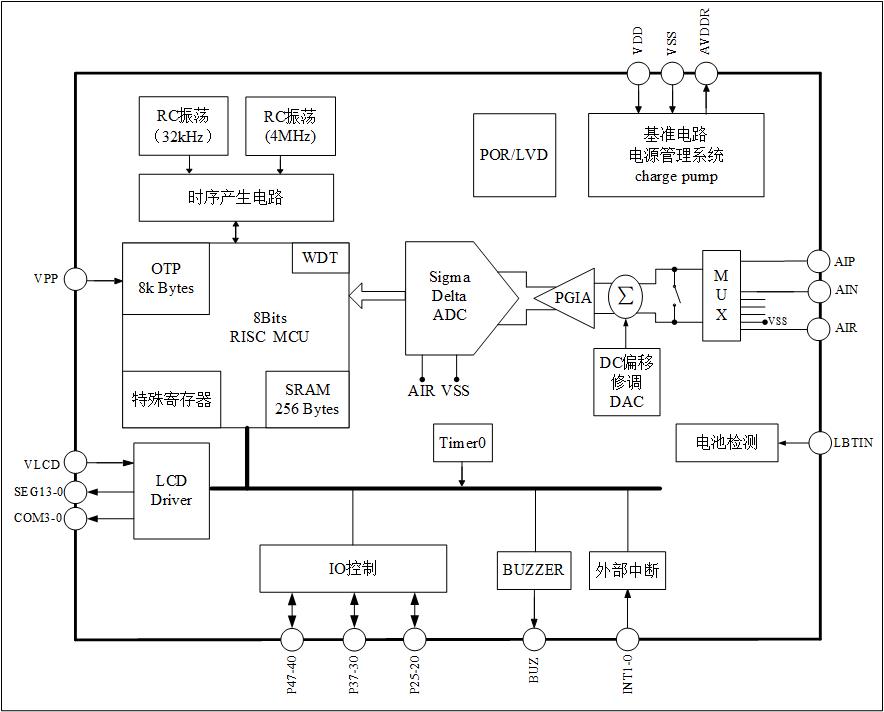 8位RISC超低功耗MCU,49條指令,6級堆棧,在2MHz工作時鐘,MCU部分在3V 工作電壓下電流典型值為800μA; 32kHz時鐘待機(jī)模式下工作電流2μA,休眠模式 電流典型值為1μA
