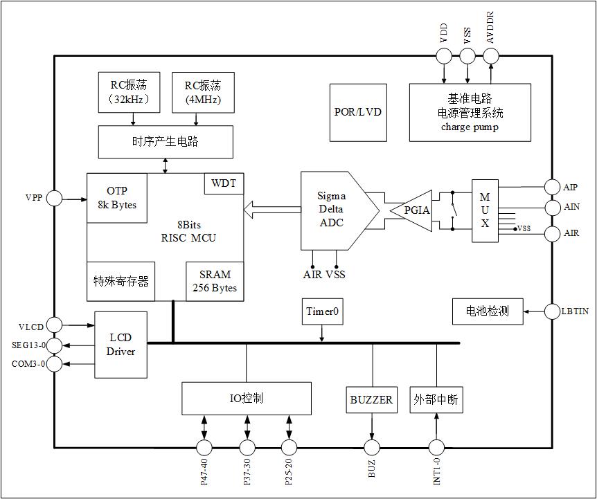 8位RISC超低功耗MCU,49條指令,6級(jí)堆棧,在2MHz工作時(shí)鐘,MCU部分在3V 工作電壓下電流典型值為500μA; 32kHz時(shí)鐘待機(jī)模式下工作電流1.5μA,休眠模 式電流典型值為1μA