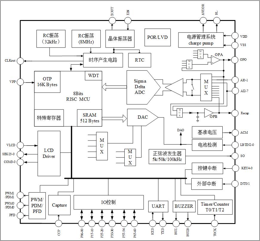8位RISC超低功耗MCU,49條指令,6級(jí)堆棧,在2MHz工作時(shí)鐘,MCU部分在3V 工作電壓下電流典型值為400μA; 32kHz時(shí)鐘待機(jī)模式下工作電流1.5μA,休眠模 式電流小于1μA