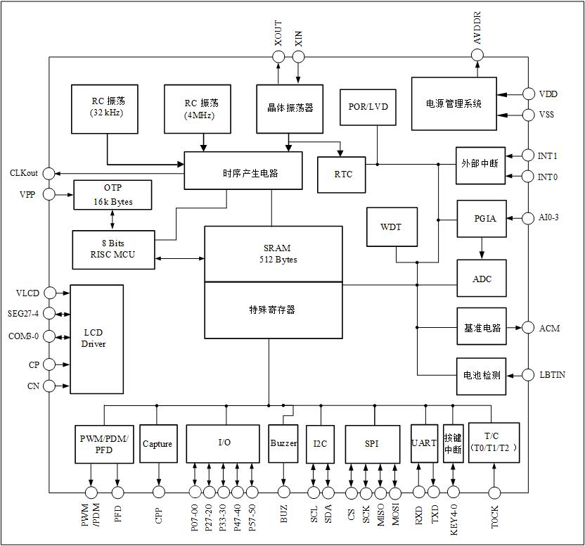 16k Bytes OTP程序存儲器,512Bytes SRAM數(shù)據(jù)存儲器