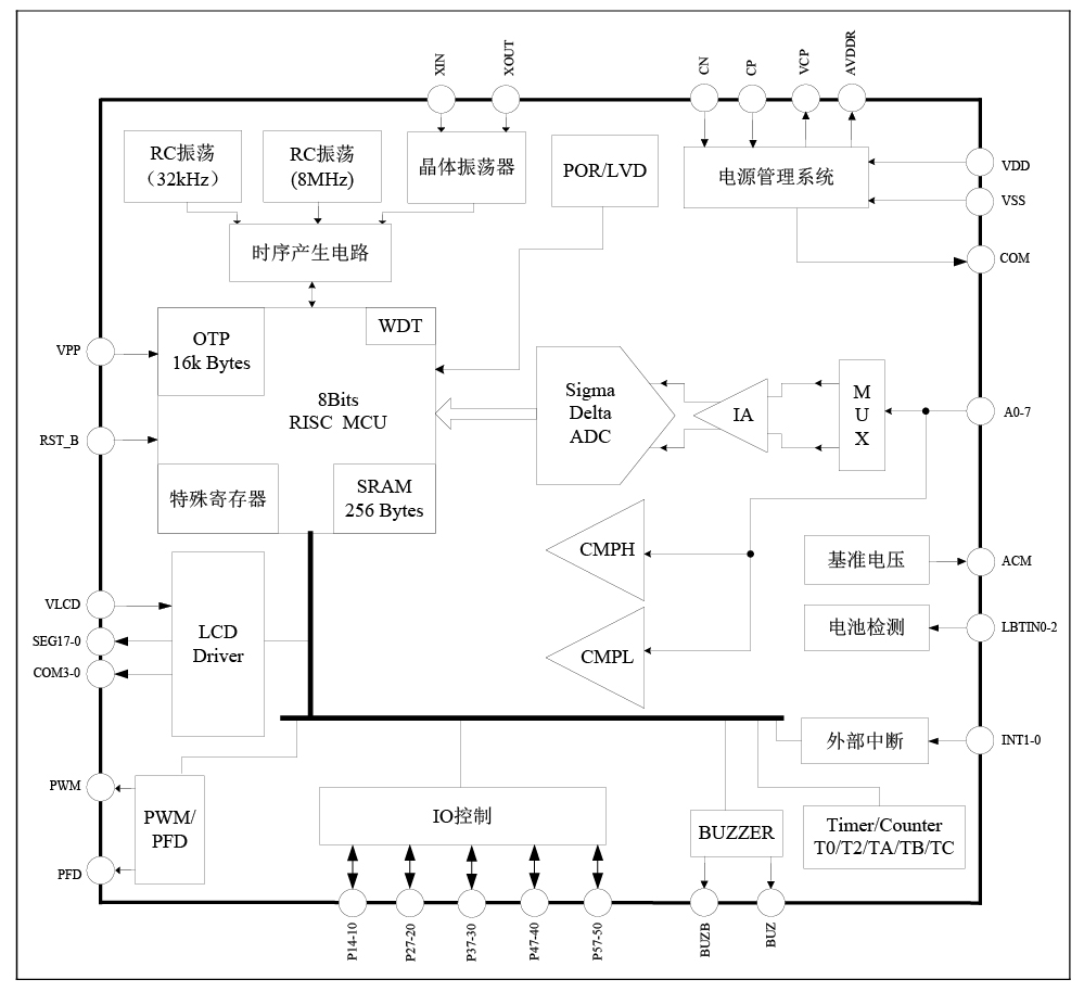 8 位 RISC 超低功耗 MCU, 49 條指令, 6 級堆棧,在 2MHz 工作時鐘, MCU 部 分在 3.3V 工作電壓下電流典型值為 400μA; 32kHz 時鐘待機模式下工作電流 1.5μA, 休眠模式電流小于 1μA