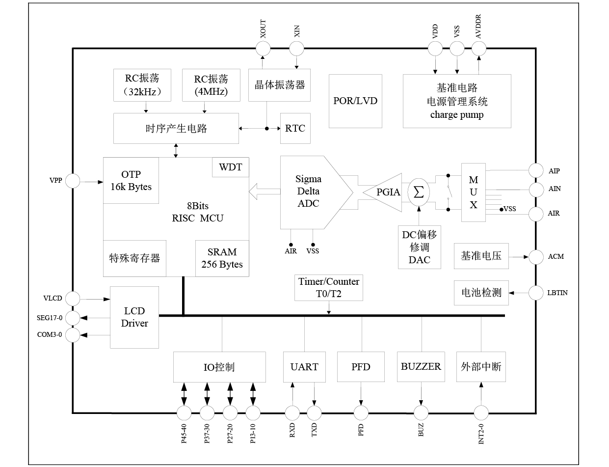 本芯片是帶 20 位 ADC 的 SoC 產(chǎn)品, 程序存儲器為 16k Bytes OTP,可以低壓自燒錄, 燒錄電壓范圍: 2.4V ~ 3.6V, 用于替代外部EEPROM。 外圍只需要 5 個電容,器件很少,非常適合人體秤等家用秤應用。