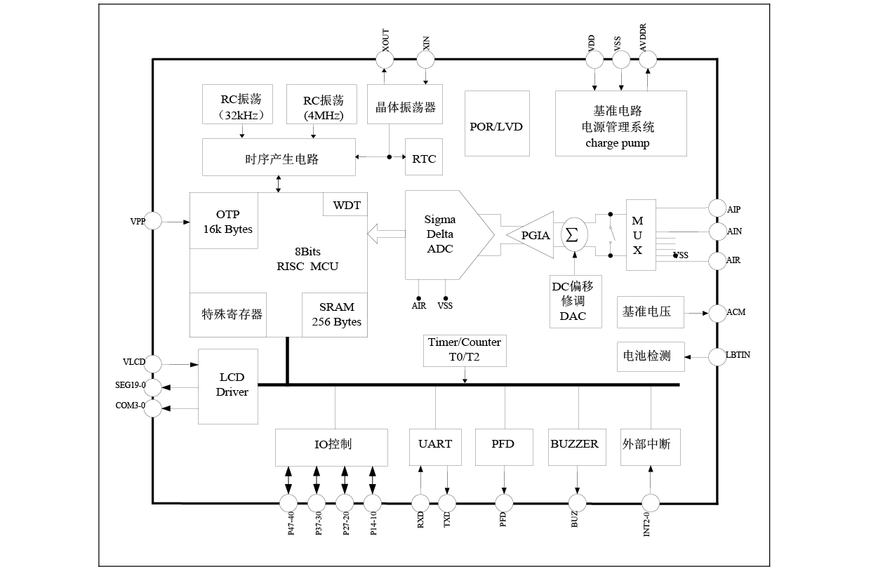 內(nèi)置高頻 4MHz 和低頻 32kHz 的 RC 振蕩,無(wú)需外部時(shí)鐘