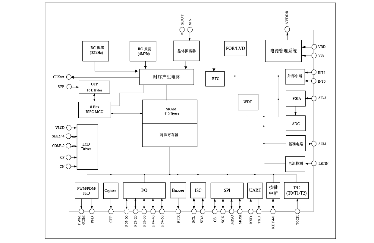 本芯片是高精度24位ADC的SoC產品,外圍資源豐富:RTC,可選的多種穩(wěn)壓電源輸出,靈活設置的PGIA模塊,升壓模塊, UART、I2C、SPI、TIMER、PWM/PDM、PFD、CAPTURE輸出模塊,LCD驅動等。