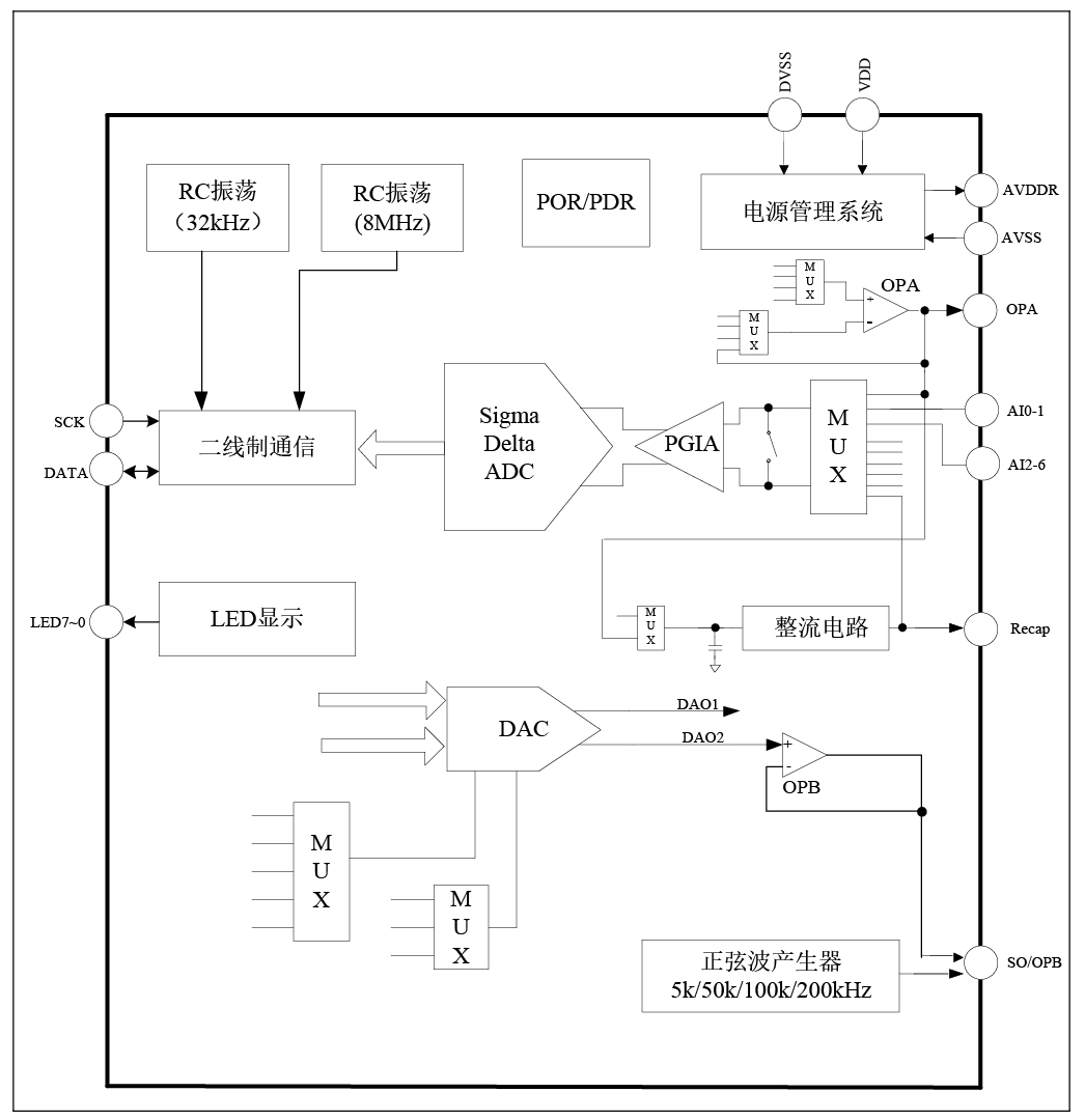 本芯片內(nèi)置24位ADC、LED驅(qū)動(dòng)、兩線制通信等電路。