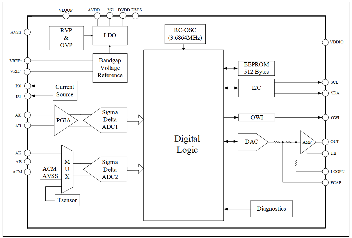 內(nèi)置一路低溫漂電壓激勵源,激勵電壓可選為2.5V和4V