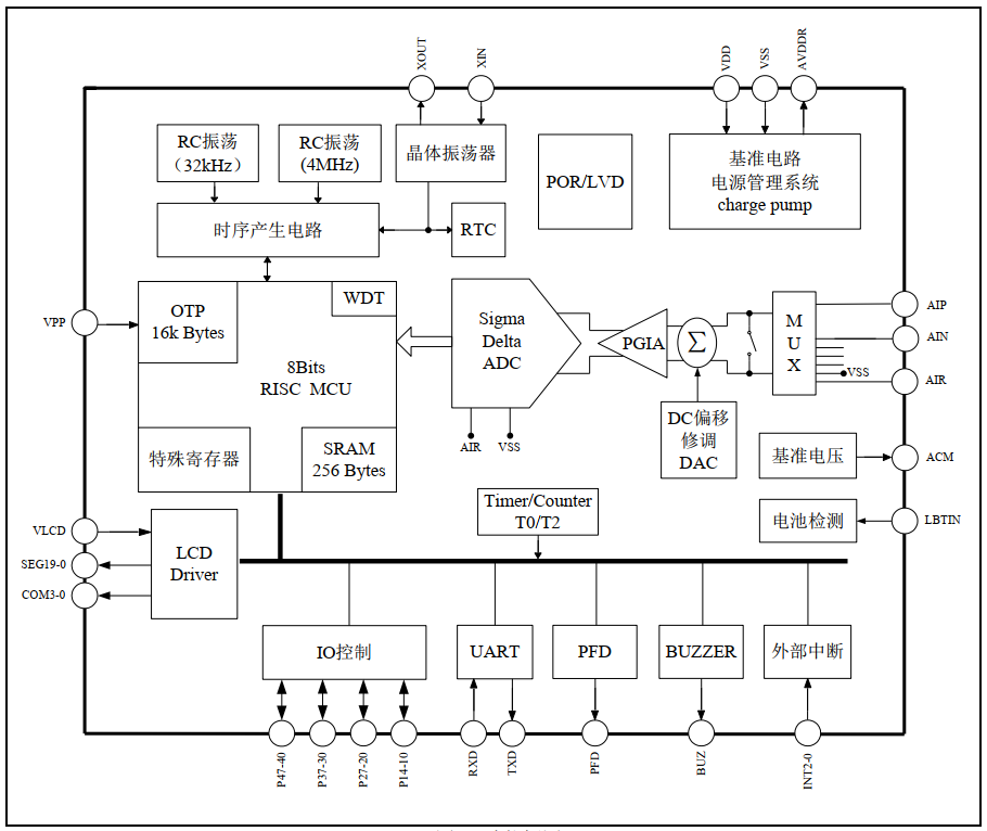 8位RISC超低功耗MCU,49條指令,6級堆棧,在2MHz工作時鐘,3V工作電壓下電流 典型值為600μA; 32kHz時鐘待機模式下工作電流1.8μA,休眠模式電流典型值為1μA